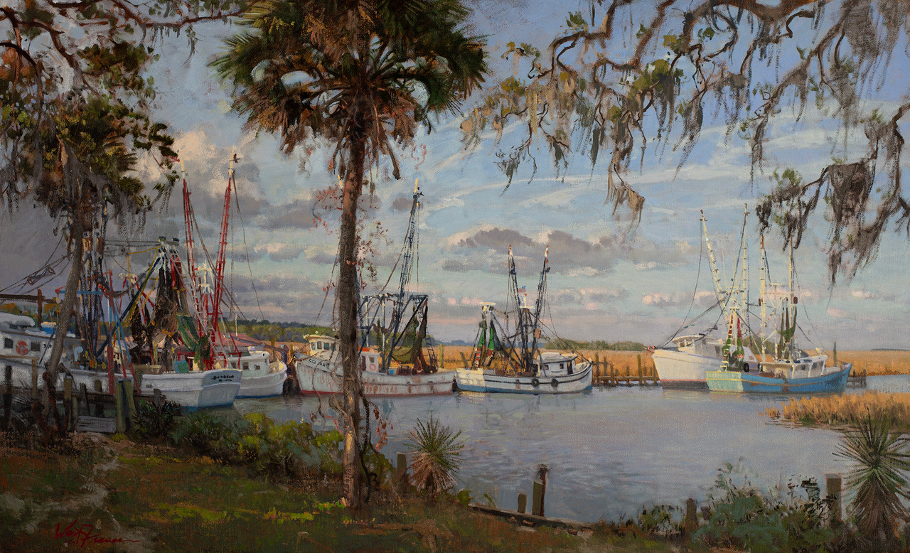 West Fraser, born 1955, in Savannah, Georgia. He received his B.F.A degree from the University of Georgia in 1979. The following year in Savannah, he worked independently as an illustrator and began his first serious painting in watercolors. He moved to Buck’s County, Pennsylvania and then in 1984, resettled in Charleston, South Carolina, where he currently lives with his wife Helena Fox. His work through the 1980’s were tightly detailed marine watercolors, which garnered Fraser national recognition and numerous national awards, a 1984 two-man show at the Grand Central Art Galleries in New York City, and his first one-man exhibition at the Gibbes Museum of Art in Charleston in 1986. In 1990, he shifted to representational/plein air painting in oil. Since then, he has primarily specialized in coastal landscapes, streetscapes and travel paintings. Fraser has been honored with 9 solo museum exhibitions in the Midwest, the Southeast, and California. His most recent museum exhibition, Painting the Southern Coast: The Art of West Fraser, Gibbes Museum in Charleston, South Carolina 2017. Fraser has been published extensively, including features in Art and Antiques, Plein Air Magazine, The Robb Report, Southern Accents, American Artist, Nautical Quarterly South West Art, Hemispheres, Garden and Gun to name a few. Exhibition catalogs and books exists of his work from solo museum exhibitions, The Color of Light, 1995 Springfield Museum of Art, OH and A Native Son, 2012 Telfair Museum of Art, Savannah, GA.  In 2000, he represented South Carolina in the bicentennial celebration calendar published by the White House Historic Association. In 2001, the University of South Carolina Press published the monograph Charleston in My Time: The Paintings of West Fraser, which was accompanied by a traveling exhibition to Southeastern museums. In 2016, the University of South Carolina Press published the monograph Painting the Southern Coast: The Art of West Fraser, In June 2004, Fraser was appointed to the Board of Directors of the South Carolina Arts Commission and in 2006 Fraser painted the official portrait of SC Governor Mark Sanford. Fraser’s art can be seen in 8 permanent museum collections from Bermuda to California. Read Full Bio